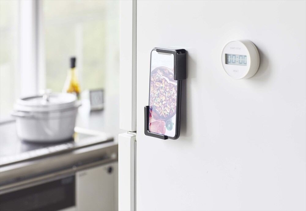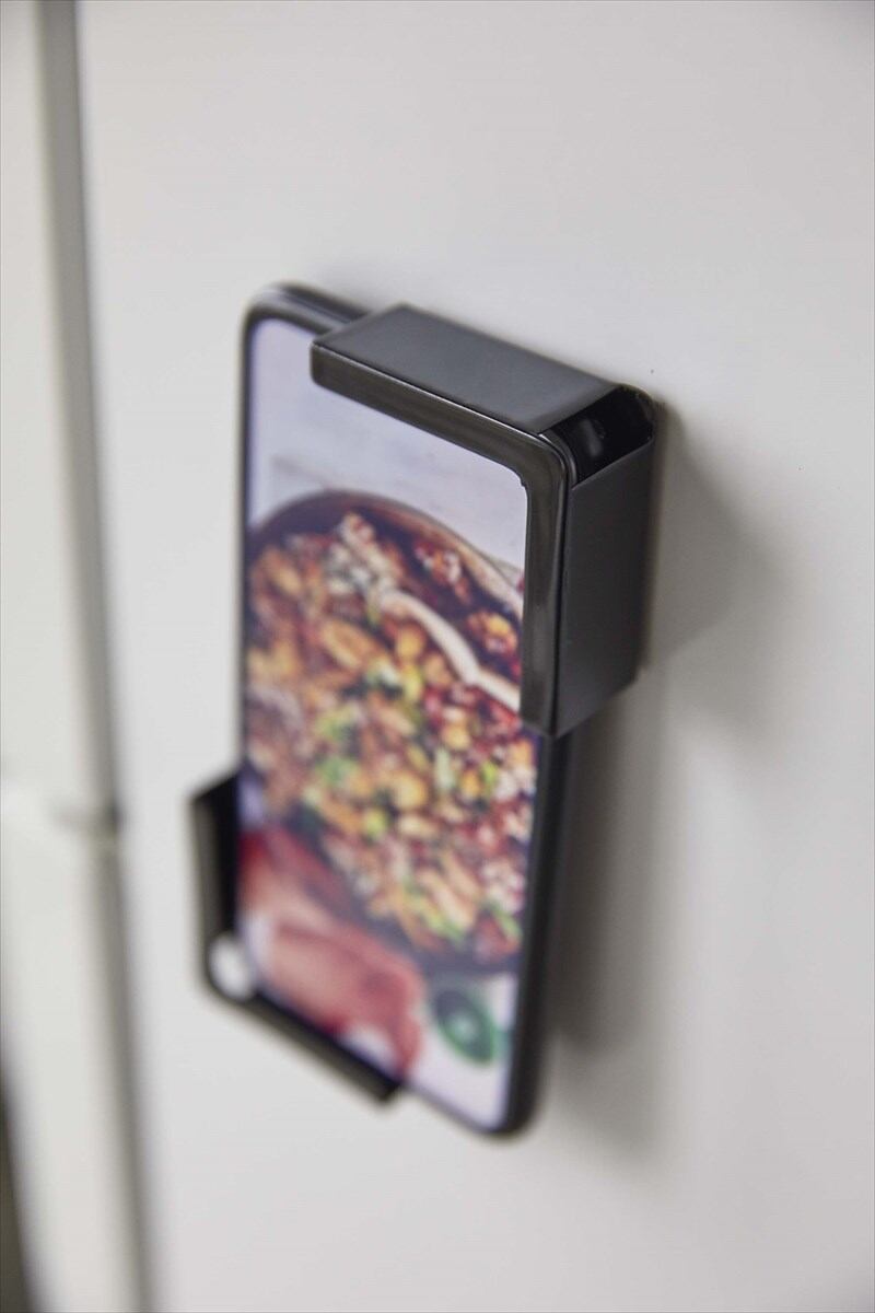 強力マグネットで冷蔵庫に簡単取り付け!スマートフォンのサイズに合わせて挟んで固定!挟んで固定させるからスマートフォンからタブレットPCまで様々なサイズに対応!