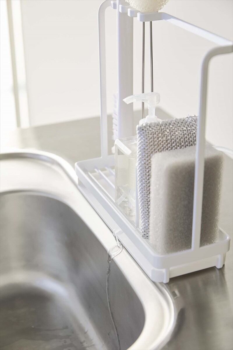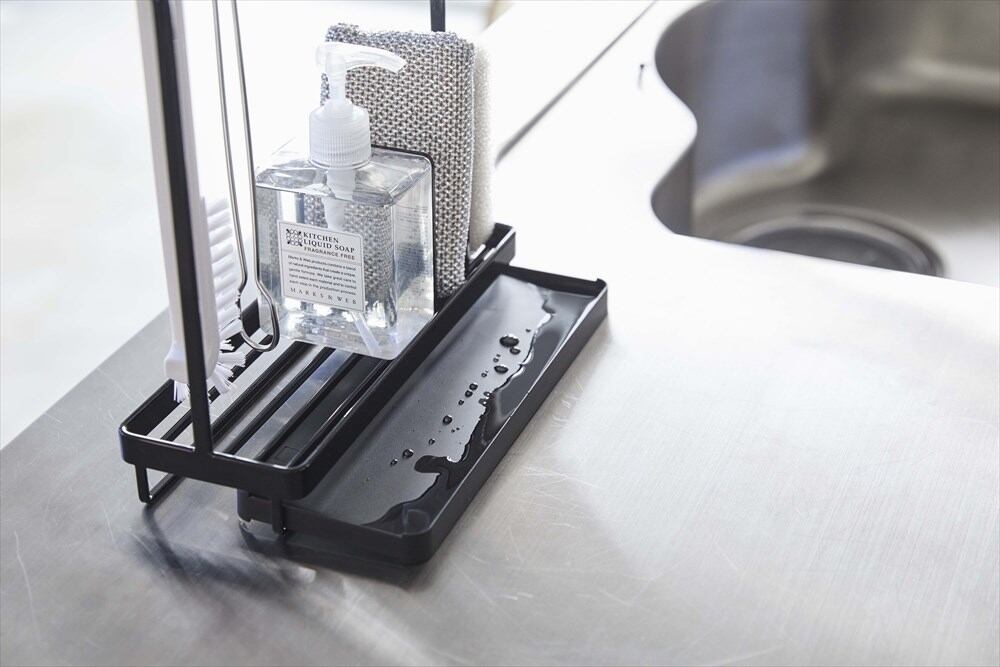 シンクの横に置いてスポンジやキッチンの掃除道具・ディスペンサーボトルまでまとめて一括収納!トレーは両面で使える仕様になっているから、使う場所に合わせて選べます。マグボトルやシンクの掃除ブラシを引っ掛けて簡単収納!スポンジは種類に分けて2個収納できます。トレーに傾斜がついているから、直接シンクに水が流れます。トレーは裏返せば、水が流れず貯められる