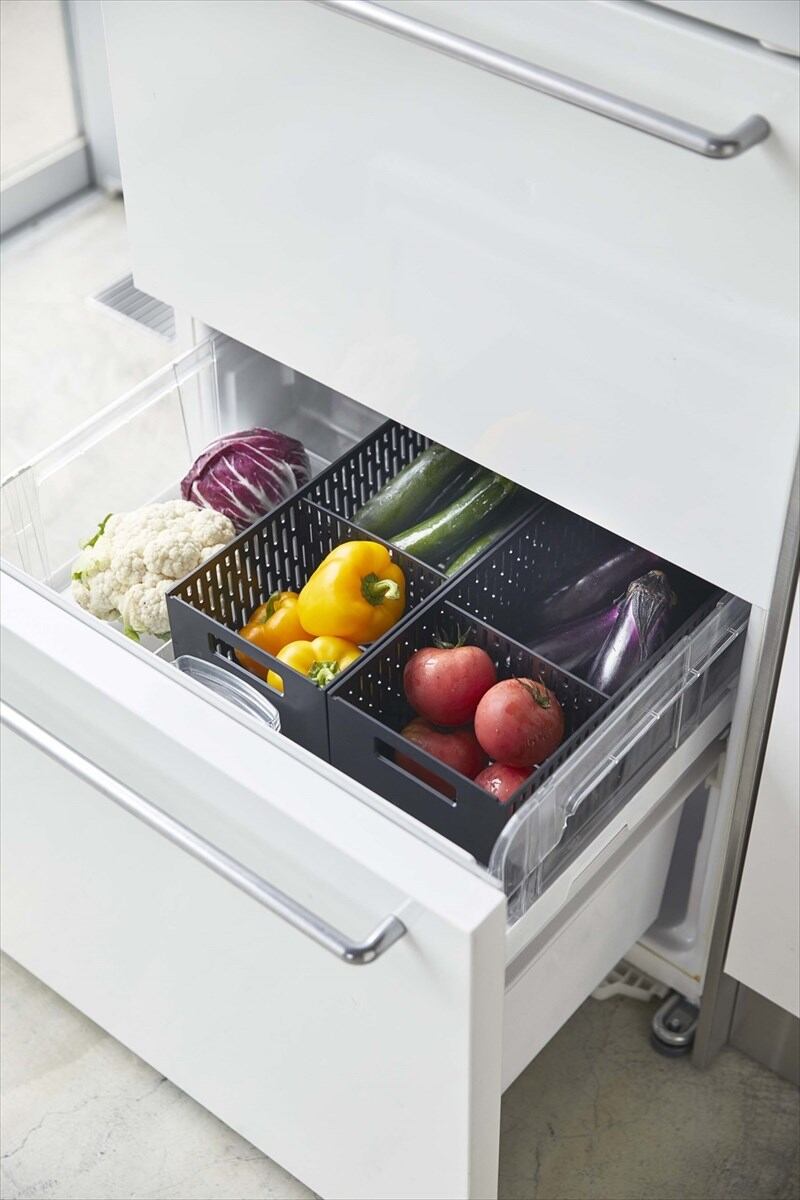 根菜の整理に便利な可動式の仕切り付きストッカー。2個までスタッキング出来て、一緒に使えば更に便利! スタッキングしたストッカーの上段の持ち手を持ってスライドして引き出せます。前後以外は穴が空いているので通気性も抜群。野菜のサイズに合わせて仕切りの位置が変えられるので冷蔵庫の野菜室の整理にも便利です。