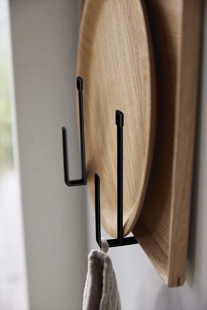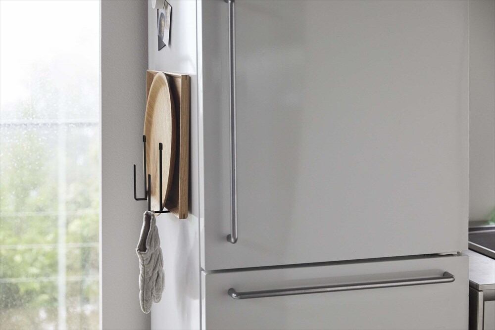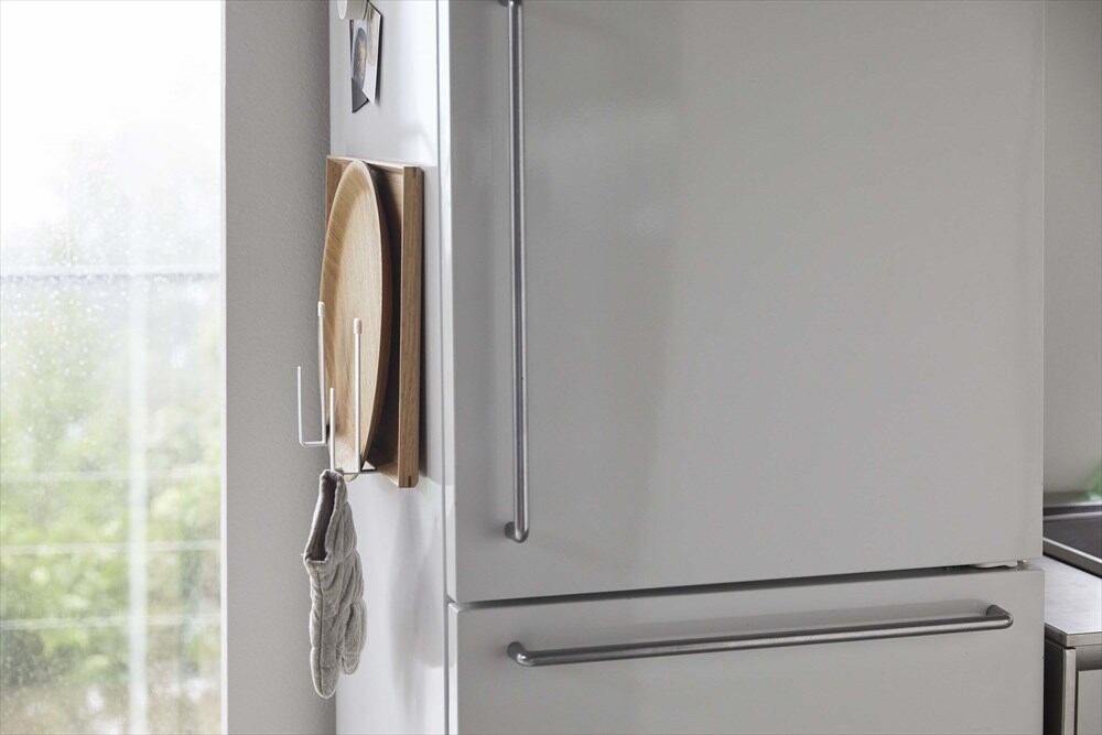置き場所に困るキッチントレーを一括収納。トレーの大きさに合わせて幅を調整できる2個組のトレーホルダー。2個組で幅を調整できるから、収納するトレーの大きさを選びません。円形のトレーも収納可能です。フックとして使用しても便利です。オーブン天板やトースター天板の収納場所として。レシピホルダーとして。フックとしても使用可能。