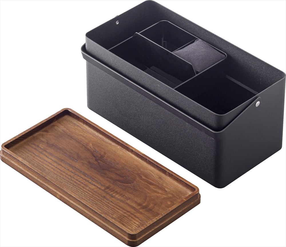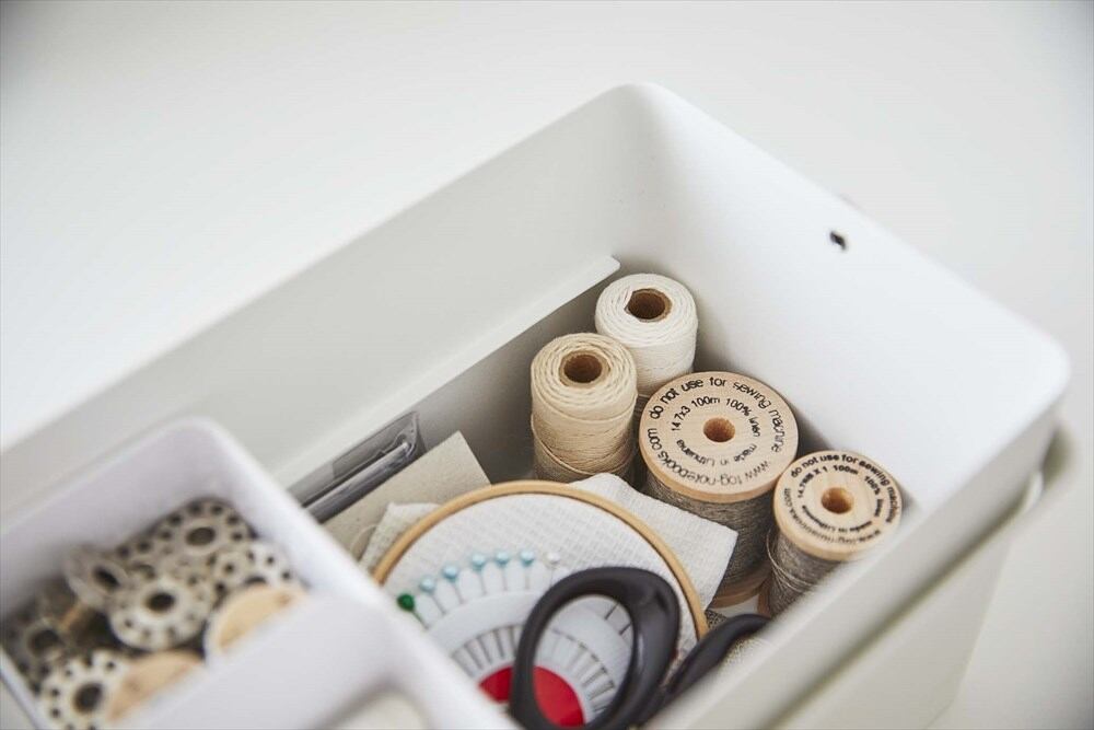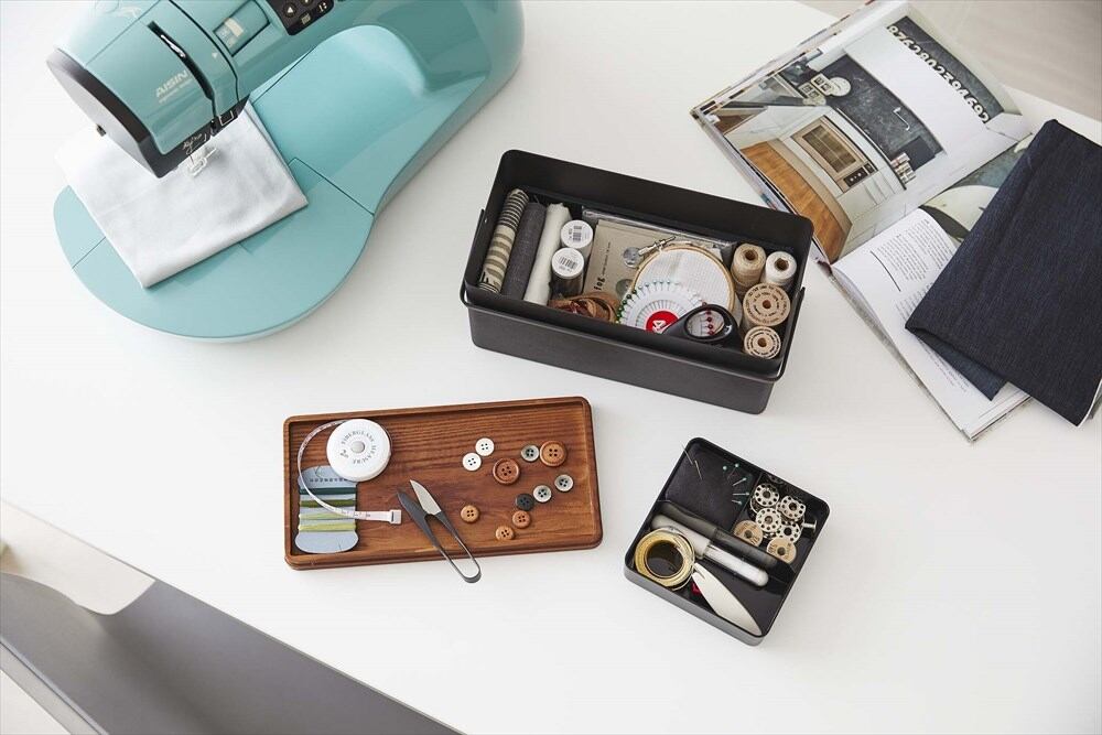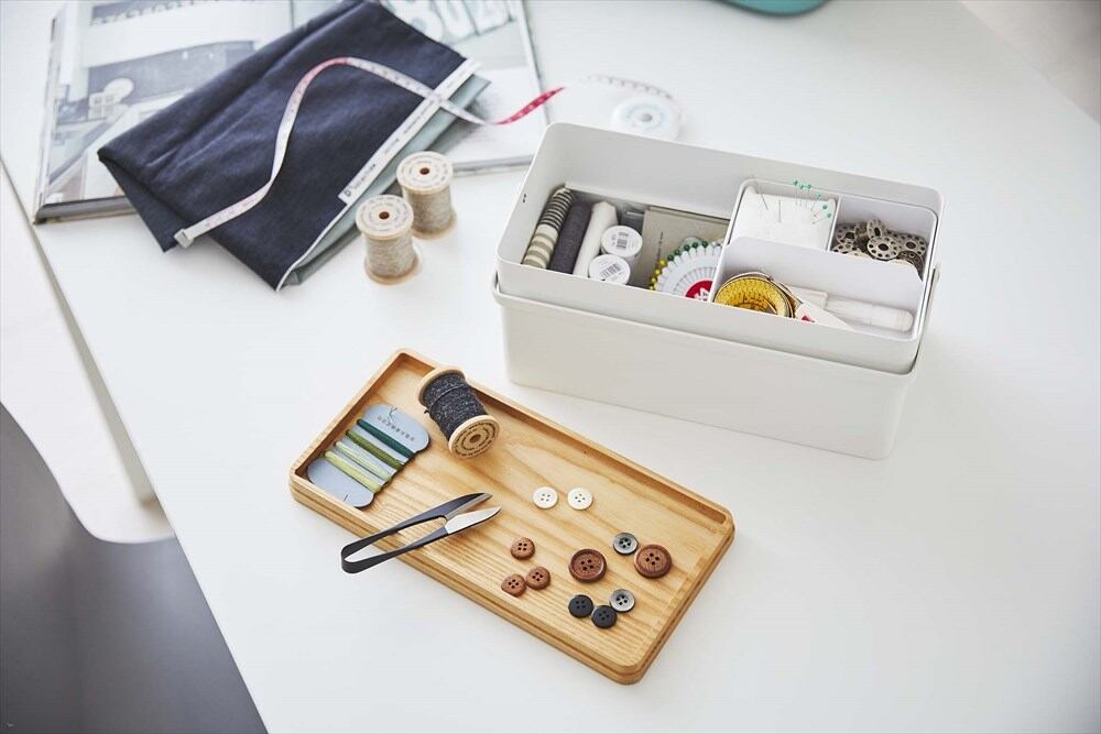 毎日の暮らしにちょうどいい。モダンでスタイリッシュなソーイングボックス。裁縫用品を収納するのにちょうどいいサイズ。お手持ちの裁縫用具を収納して便利にご使用いただけます。トレーは取り出すことができるので、卓上で道具類を散らかさずに裁縫できます。上段のトレーはスライド式。縦・横どちらの向きでも収納できます。木蓋を裏返せばトレーとしてご使用いただけます。持ち運びに便利な取っ手付き。