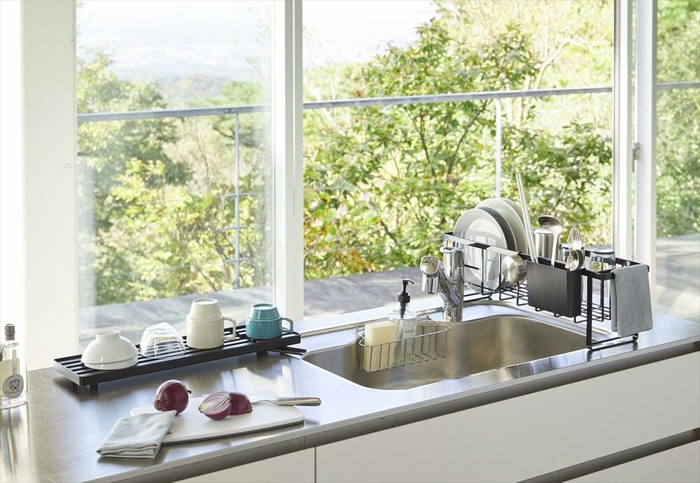 置き場所を選ばないスリムな2WAY水切りワイヤーバスケット。トレーと分けて違う場所で使用することができます。ワイヤーバスケットはシンクに渡らせて使用することもできます。水切りトレーは、本体と分けて使用することができます。付属のカトラリーポケットはお好きな場所に。本体の中にもセット可能。付属のフックはお好きな場所に取り付けていただけます。直接シンクに水が流せる可動式の水はけ付き。水止栓つきなので、排水できない場所でも使用可能。