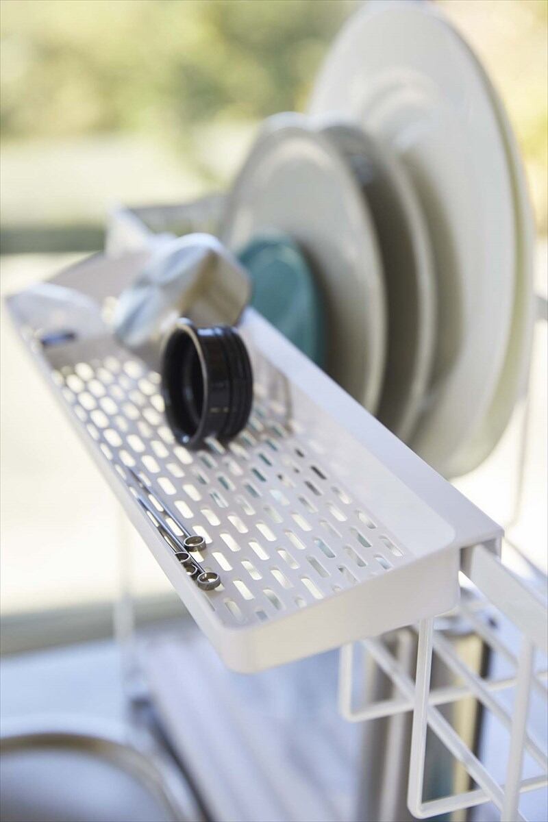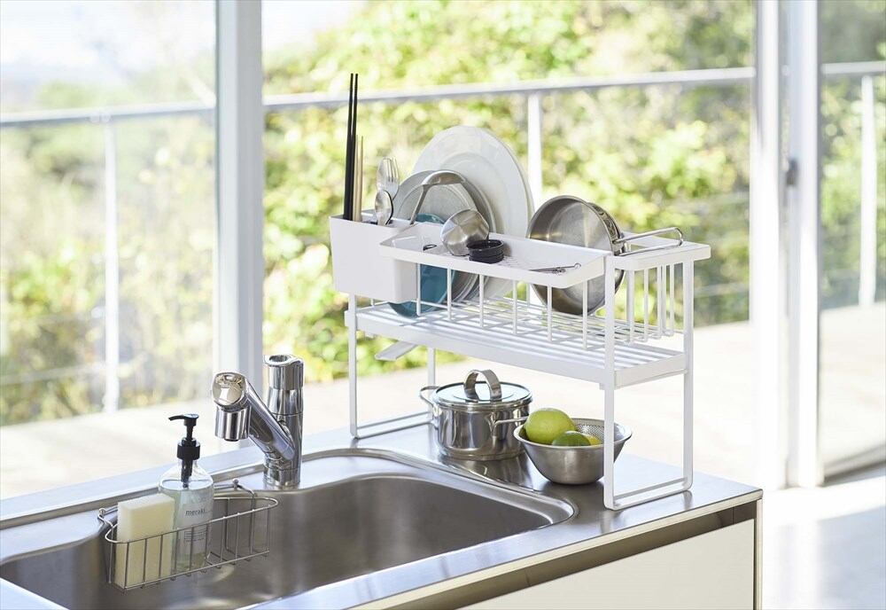 シーンに合わせて使い方様々!スリムな水切りワイヤーバスケット2段。大容量の2段水切りとして。収納量が欲しい方に。内側のスリットを利用してお皿や鍋フタも立てられます。上段にすれば調理台に置いても使いやすい仕様に。スリムなので調理の邪魔になりません。ハンドルには布巾を掛けることもできます。水切りトレーと分けて違う場所で使用することができます。ワイヤーバスケットはシンクに渡らせて使用することもできます。