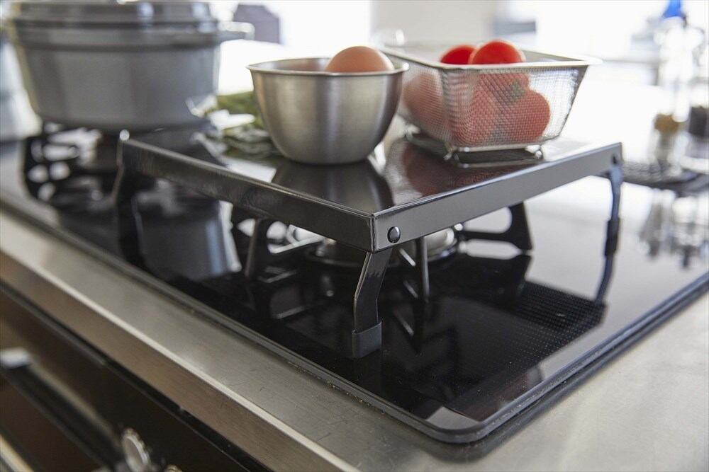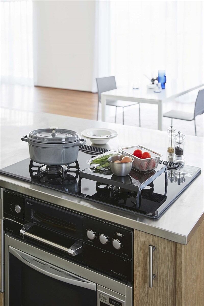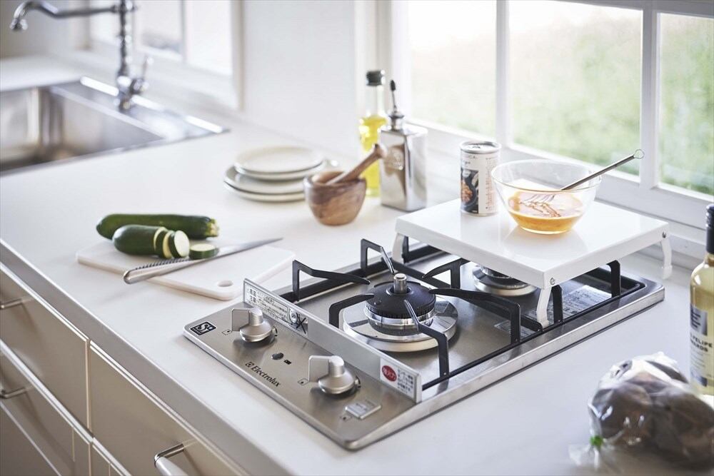 使用していないガスコンロの上が収納&作業スペースに早変わり! マンションやアパートなどの1口〜3口コンロの上に設置して収納・作業スペースになるコンパクトでサッと使えるガスコンロカバー。単身者からファミリーまで幅広く使えます。脚部はストッパー付きで倒れにくい構造です。