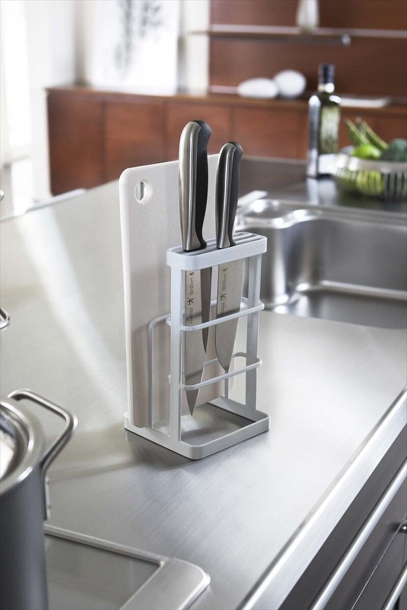 サイズや用途違いの包丁3本とまな板2枚がコンパクトに収納できます。用途に合わせて包丁とまな板を調理中にサッと取り出せるのが便利。キッチン周りをスタイリッシュに演出するシンプルなデザイン。