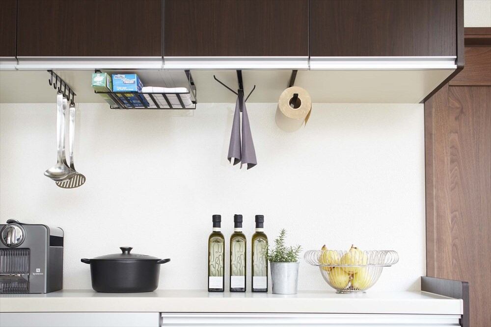 キッチンの吊り下げ戸棚に差し込むだけ!調理中によく使うお玉やフライ返しなどの調理ツールをサッと取り出せるのが便利。