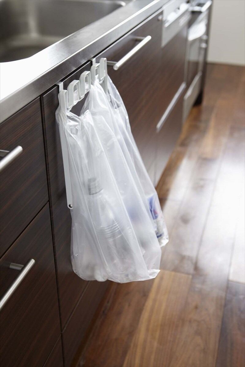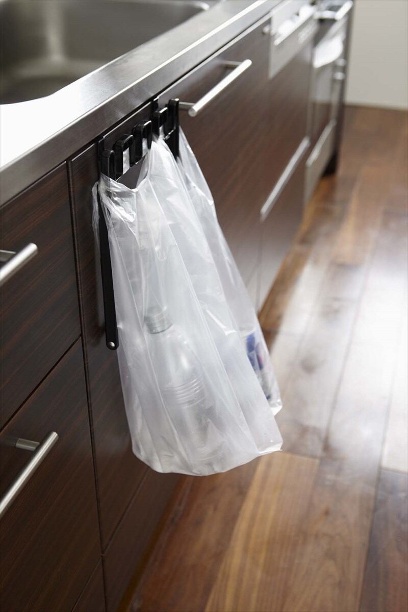 シンクのドアに設置して、スーパーのレジ袋を引っ掛けるだけで調理中にでるゴミをそばでポイ!分別も可能。