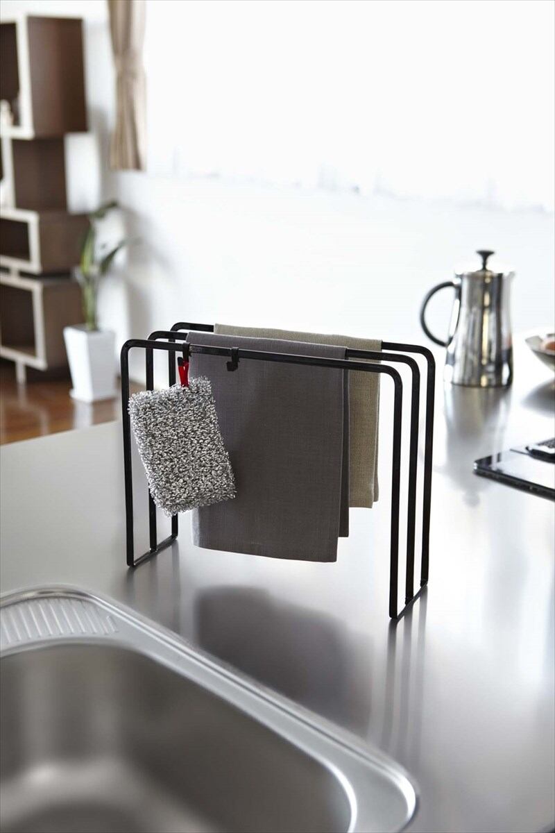 シンプルでスタイリッシュなデザインの3枚掛けの布巾ハンガー。付属品にフックが付いているので、スポンジなどの小物も干せます。
