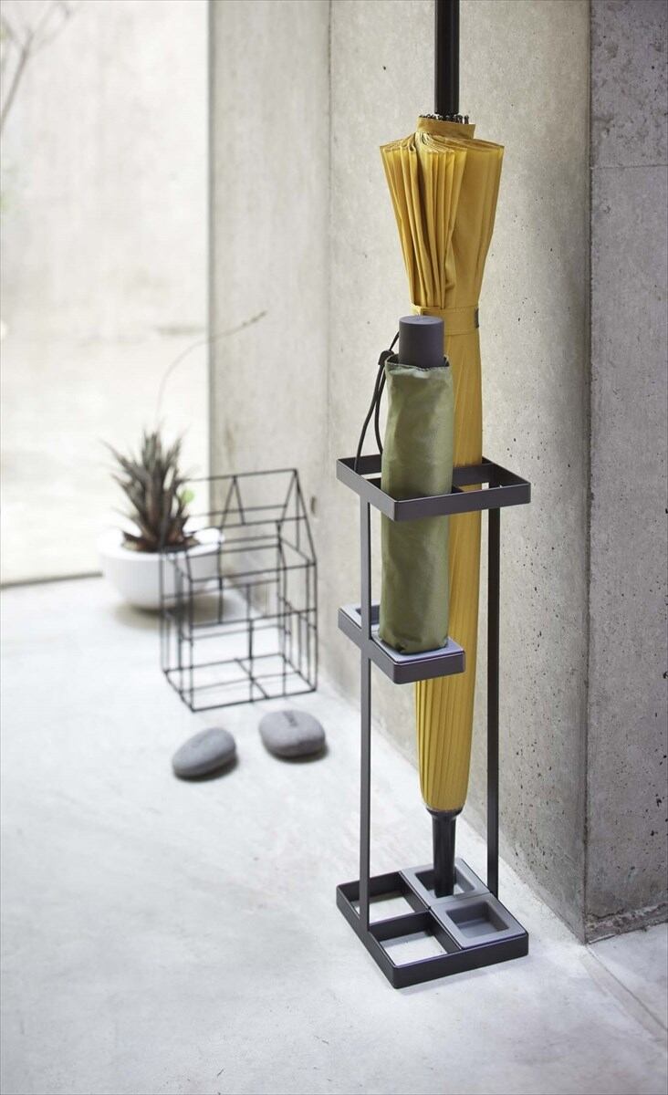 玄関の角・隅にぴったりと収まるコンパクト角型かさたて。玄関で場所をとらない省スペースデザイン設計。トレイの位置を変えれば折り畳み傘も収納可能。
