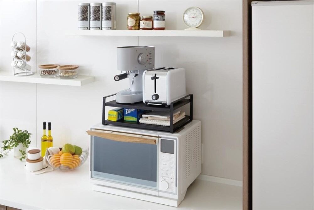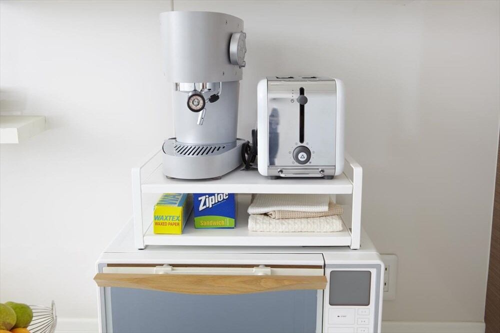シンプルで使いやすい電子レンジ上収納ラック。棚が面になっているからトースターやなど家電製品からラップ類や布巾などの細かい雑貨までしっかり収納できます。
