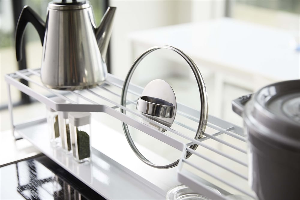 収納できる棚付き排気口カバーとコンロ奥ラックが一体になった排気口カバー付きコンロ奥ラック!排気口カバーにはスパイスボトルなどが収納できます。鍋蓋を立てて収納できる天板。排気口カバーはスライドして簡単移動!取り外せるからお手入れ簡単。飛び散る油や調理汚れでこうなる前に