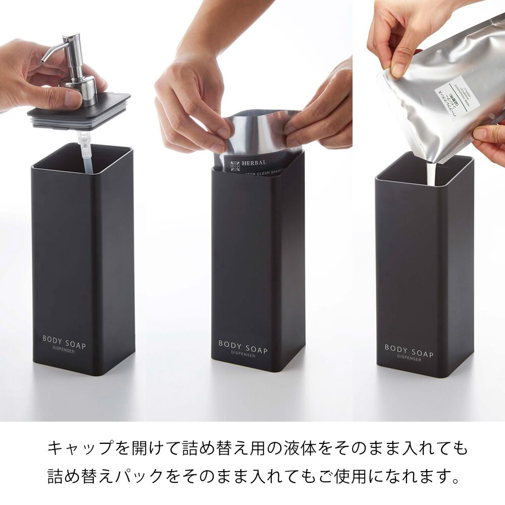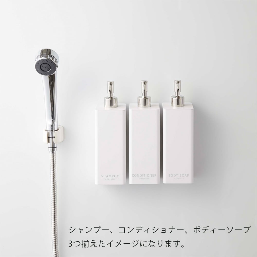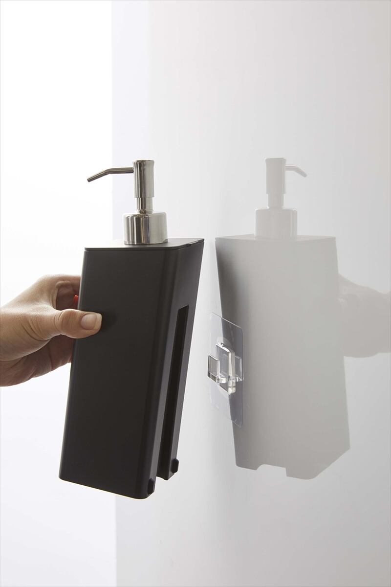 フィルムフックで壁面に浮かせて収納できるから、底がぬめらず衛生的。そのままポンプも押せます。壁面のフィルムフックにかけるだけ。蓋が外れるので、詰め替えが簡単。詰め替え用袋がそのまま入ります。蓋が外れるのでお手入れ簡単。