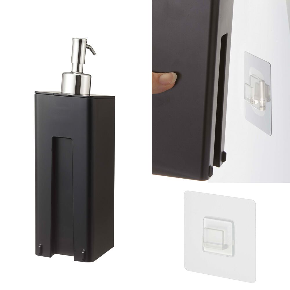 フィルムフックで壁面に浮かせて収納できるから、底がぬめらず衛生的。そのままポンプも押せます。壁面のフィルムフックにかけるだけ。蓋が外れるので、詰め替えが簡単。詰め替え用袋がそのまま入ります。蓋が外れるのでお手入れ簡単。
