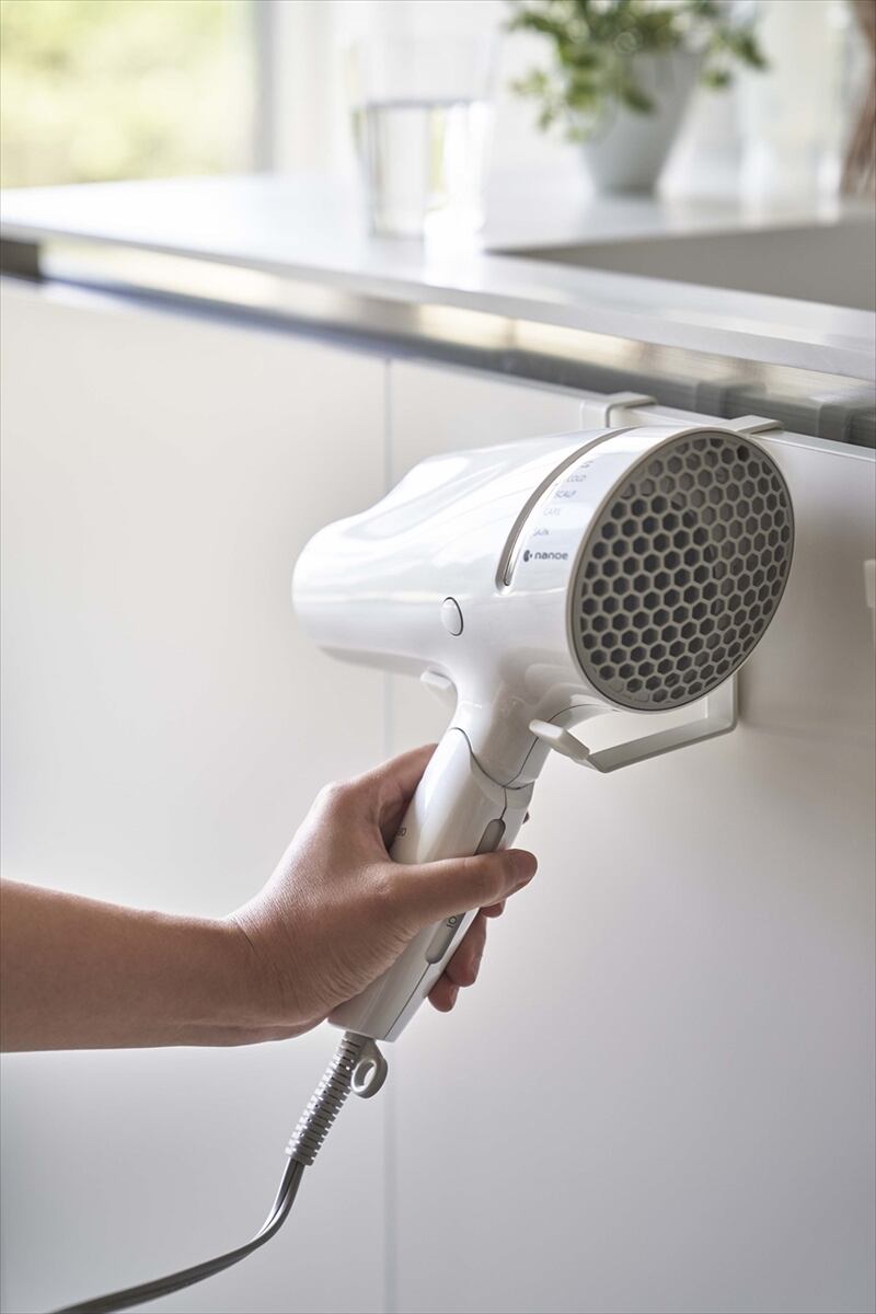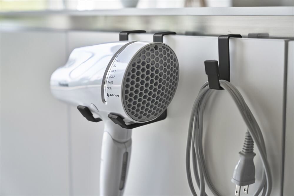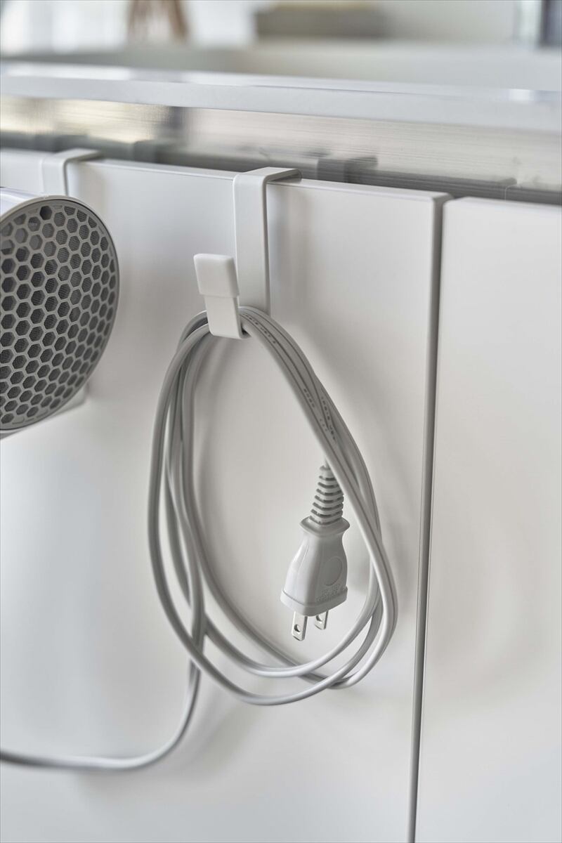 洗面シンク扉にドライヤーを掛けるだけの簡単収納。ドライヤーを掛けるだけの簡単収納。洗面扉に引っ掛けるだけの簡単設置。好きな位置に掛けられるコードホルダー付き。