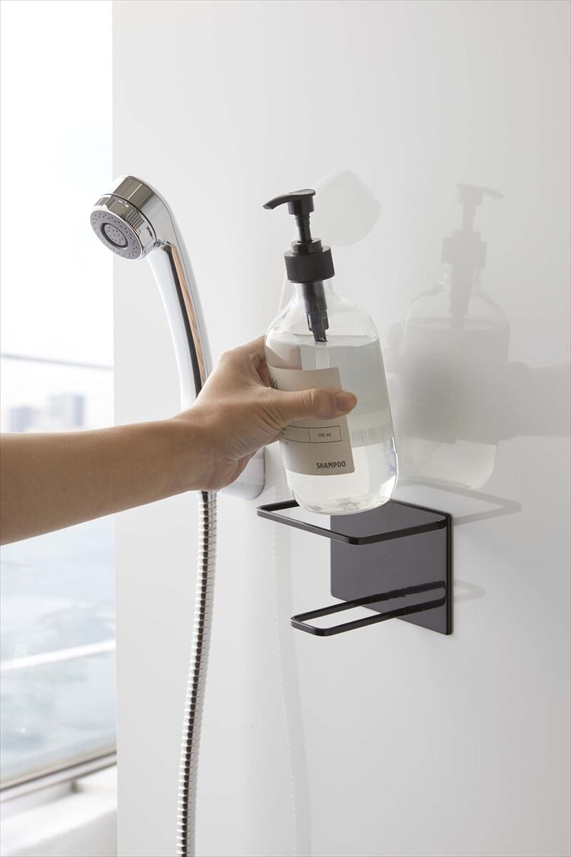 シャンプーやボディーソープなどのボトルを収納。そのまま押して使用できます。上から入れるだけの簡単設計。底に当たる接地面を少なくすることでぬめりを防止。