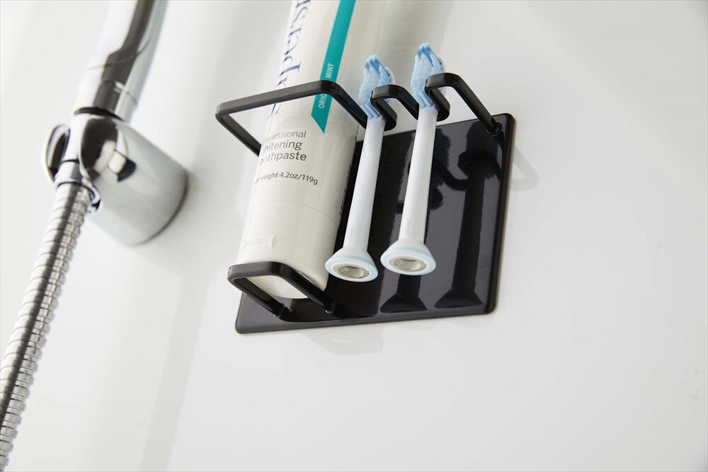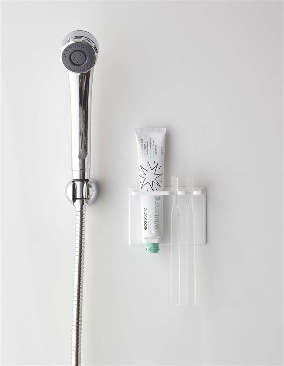 歯ブラシと歯磨き粉をまとめて収納。色々な形状の歯磨き粉に対応できる構造です。上から入れるだけの簡単設計。底に当たる接地面を少なくすることでぬめりを防止。