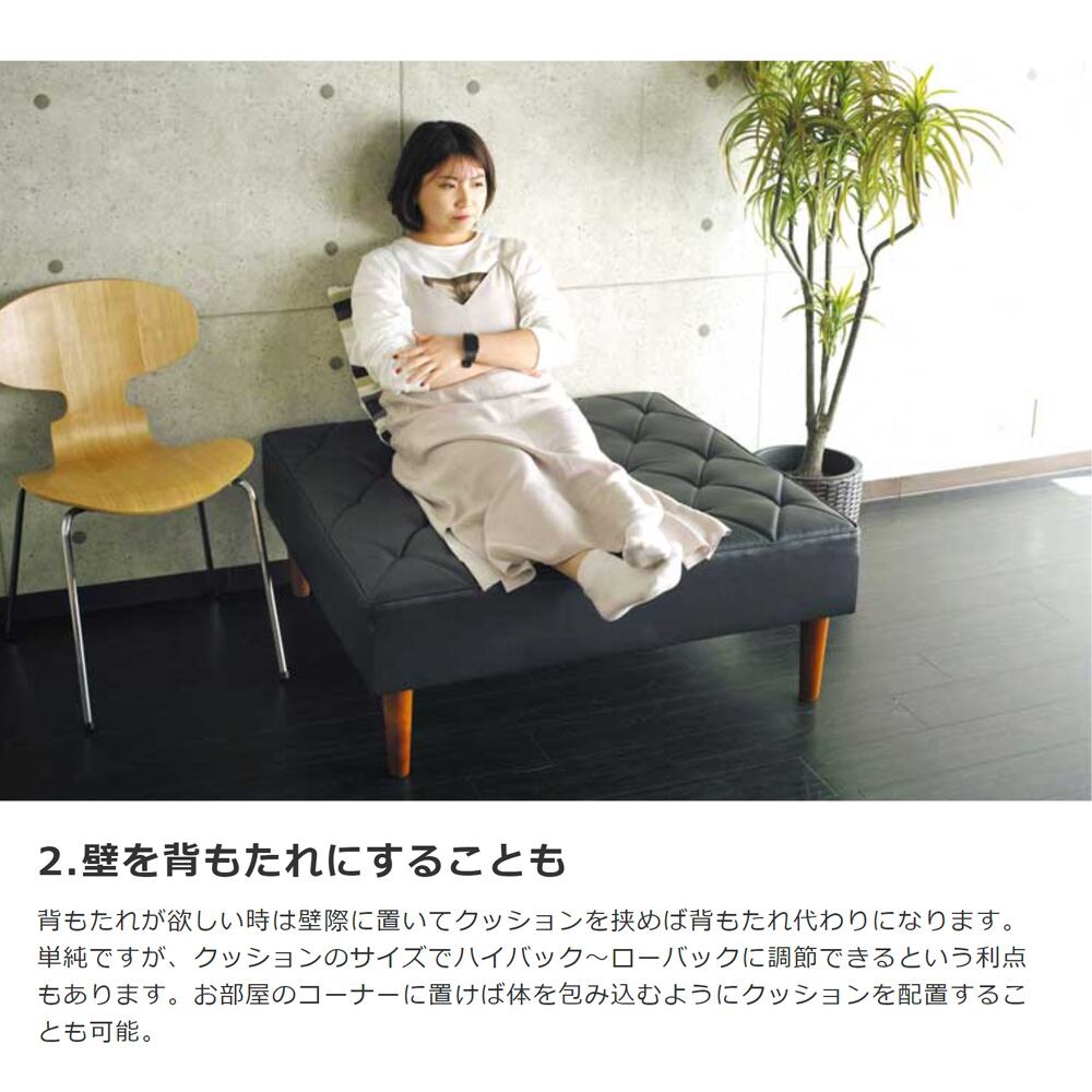 複数並べればデイベッドのように繋げたり、センターテーブルを囲んだりとさらに使い方の幅を拡げられます。背もたれがないので複数置いても空間に圧迫感を与えません。脚は取り外し式ですのでローチェアとして床座りスタイルにも。