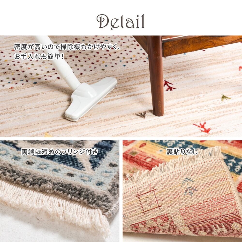 ラグの名産地トルコ製の1枚。民族調手織り絨毯の様なエスニックなデザインをウィルトン織機で織りあげました。毛足は1㎝程ありますが、密度が高いので、掃除機もかけやすいようデザインされています。縦糸の特殊加工により折りたたんで収納出来ます。