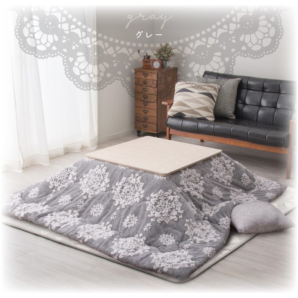 淡色遣いで派手すぎない、ささやかな可愛さの大人のフェミニン。収納もしやすい薄掛けタイプのこたつがけ布団です。なめらかなフランネル生地で、短毛と長毛の生地を立体的に織り上げてポコポコとした手触りも楽しめます。波型縫製で中綿が片寄るのを防ぎます。裏面は無地のフランネル生地です。