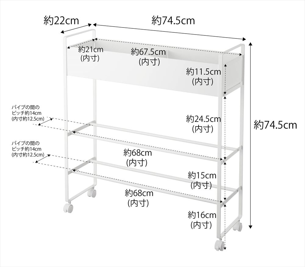 【内寸サイズ(cm)】:バスケット:約W67.5×D21×H11.5cm ボール収納部上段:約W68×D14(パイプ間のピッチ)×H24.5cm ボール収納部下段:約W68×D14(パイプ間のピッチ)×H15cm 床から下段まで:約H16cm