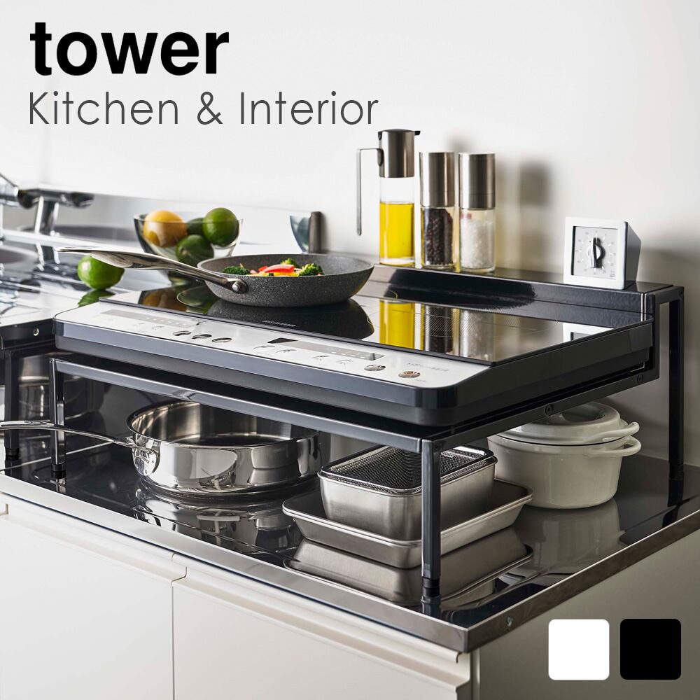 棚付きIHクッキングヒーターラック タワー ホワイト ブラック 山崎実業 北欧 モノトーン おしゃれ 人気