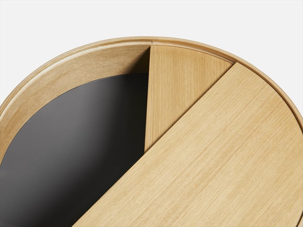 内側の収納スペースのミュートダークグレーの表面は木材を補完するために選択され、3本足の構造は幾何学的な形のデザインに遊び心と軽いタッチを加えます。
