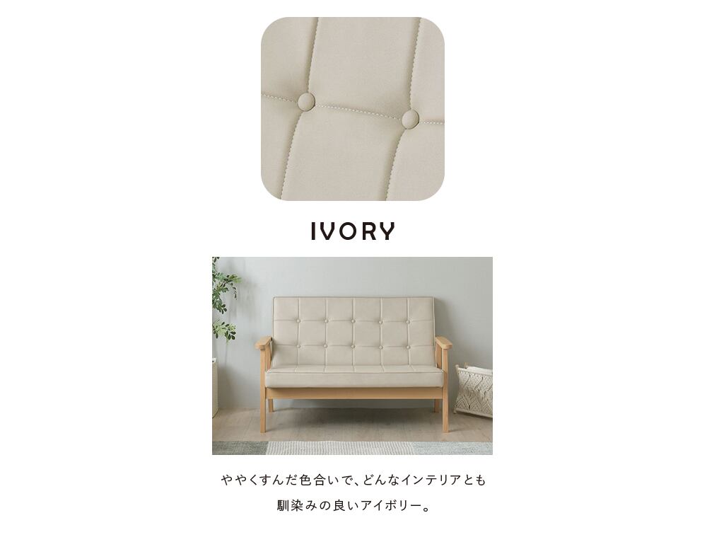 ワンルームにもすっきり収まるコンパクトソファ。くすみカラーと木肘の組み合わせが、お部屋をおしゃれな雰囲気にしてくれます。