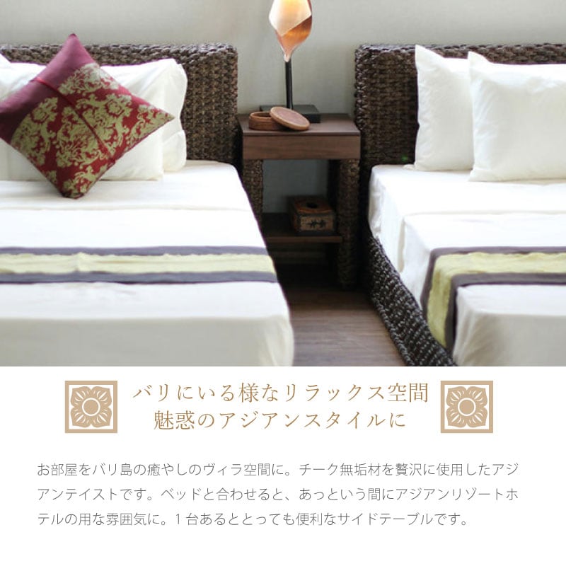 テレビの横やソファーサイド、ベッドサイドなど様々な場面で大活躍。天板の収納部や、天板下の収納部にはちょっとした物を置くのにとっても便利。チークとウォーターヒヤシンスでアジアンな雰囲気をぐっと高めます。