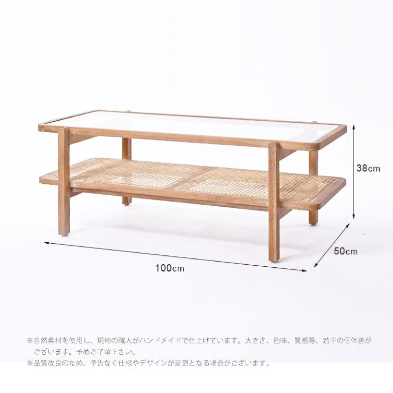ガラス天板下のラック部分にはラタンのかごめ編みをあしらい、
