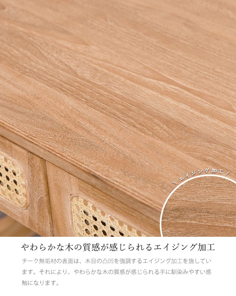 木の質感が最大限に映えるエイジング加工を施したチーク材は、