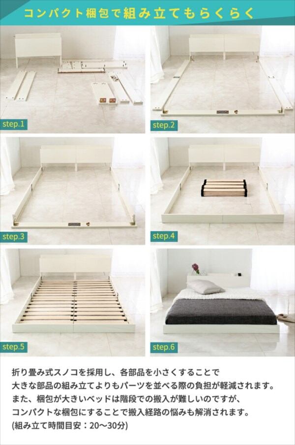 スマホや雑貨が置ける棚スペースは、使いやすいUSBポート付きの2口コンセント仕様となっております。 マットレスを落とし込むフレームのため、カバーやマットレスがずれにくく、見た目もすっきりします。