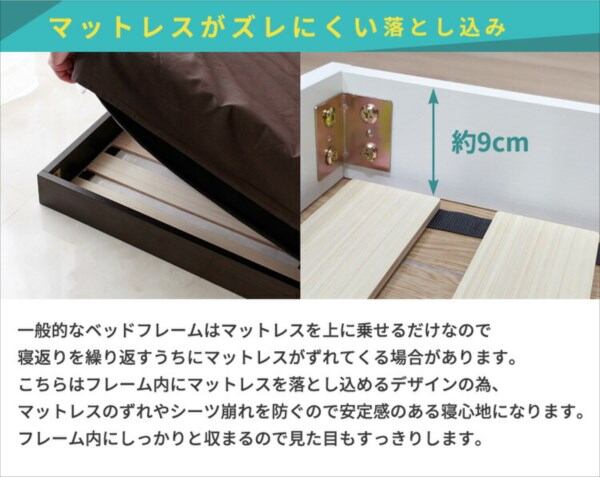 スマホや雑貨が置ける棚スペースは、使いやすいUSBポート付きの2口コンセント仕様となっております。 マットレスを落とし込むフレームのため、カバーやマットレスがずれにくく、見た目もすっきりします。