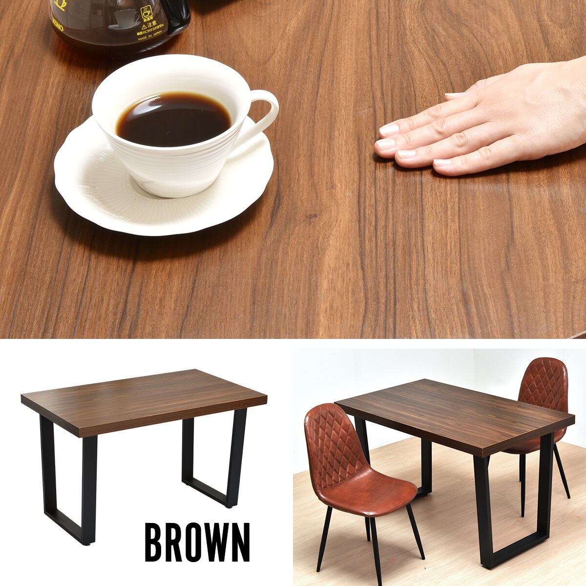 メラミンダイニングテーブル 120幅 ONDT-0055 机 テーブル ダイニング 食卓 リビング お部屋 幅120cm 高さ72cm 木目調 トラペゾイド メラミン アイアン 粉体塗装 シンプル インダストリアル かっこいい モダン おしゃれ ダークブラウン ナチュラル 暖かみ おしゃれ 人気