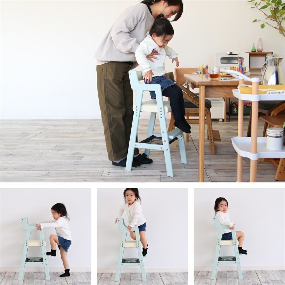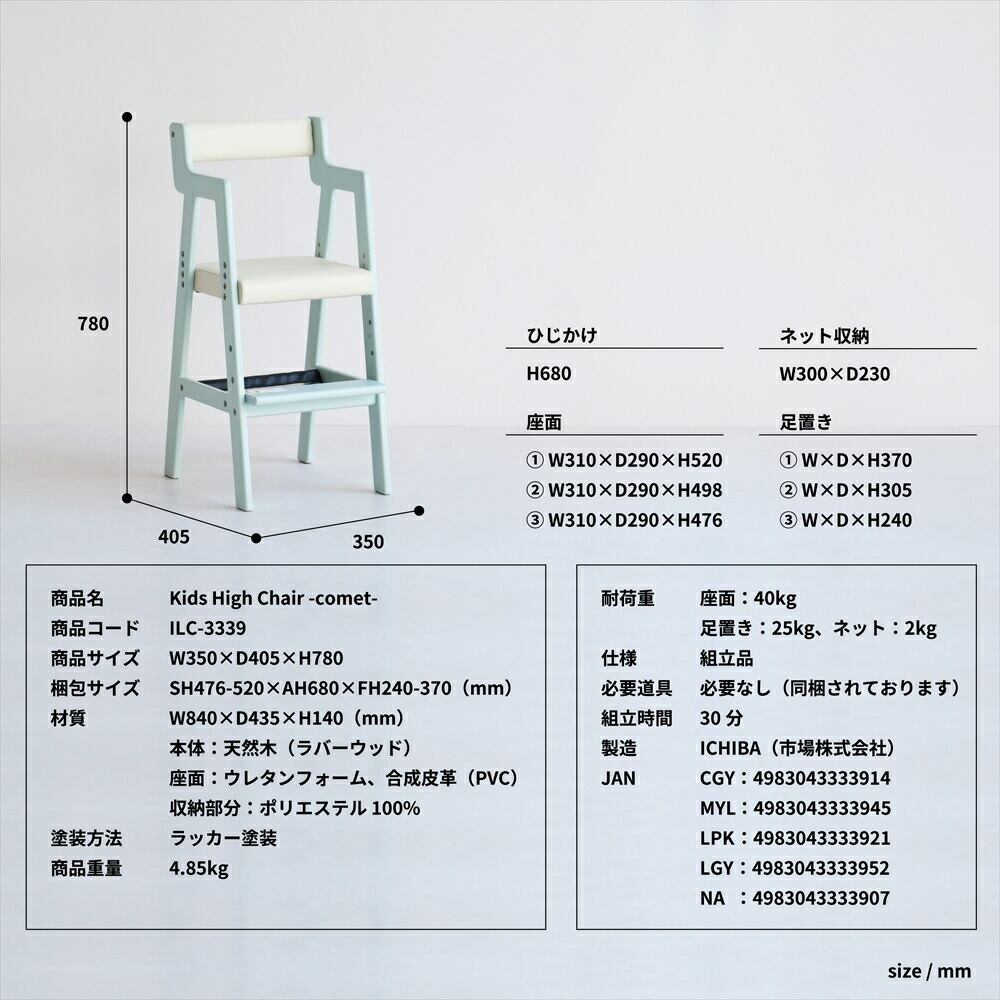 お子様の成長に合わせて、高さを変更できるキッズハイチェアー「comet」。座面と足置きは3段階で高さ調整が可能です。座面はPVCなので、柔らかい座り心地。座面下にはベビー用品などの小物を収納できるネット付きです。