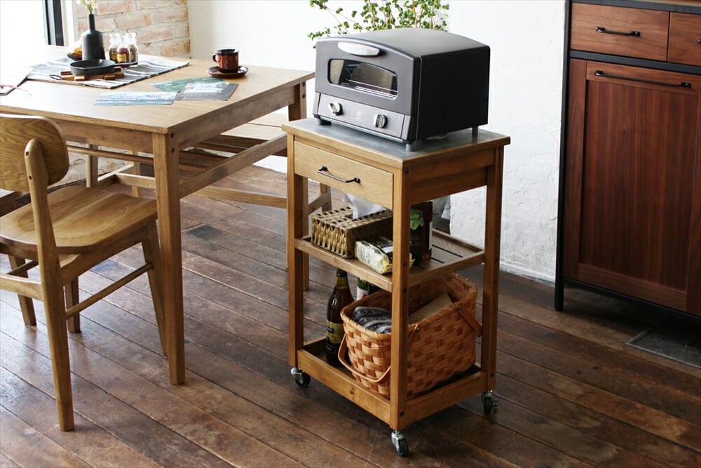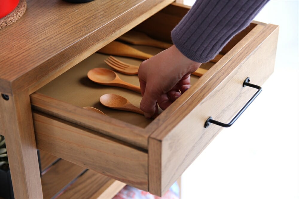 材質:天板:天然木(ラバーウッド材)、セメント/支柱:天然木(パイン材)/棚板:天然木化粧繊維板(オーク材)/取ッ手:金属(スチール)