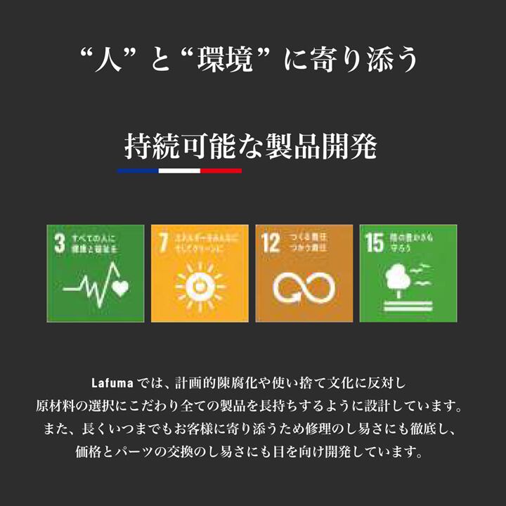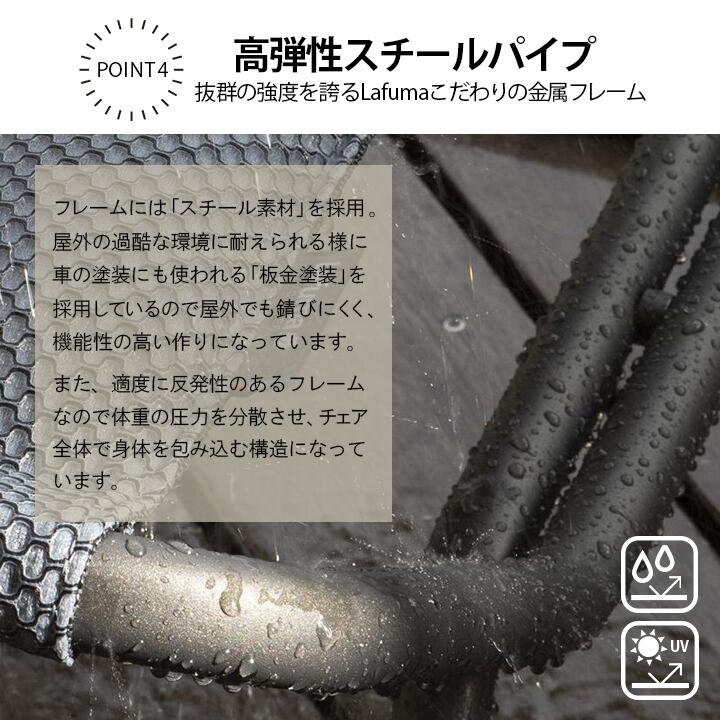 ・シートとフレームを繋ぐクリップサスペンションシステム(Lafuma特許)を採用しています。